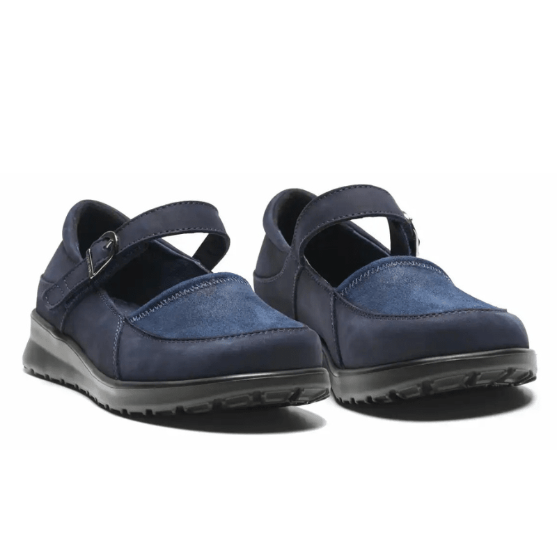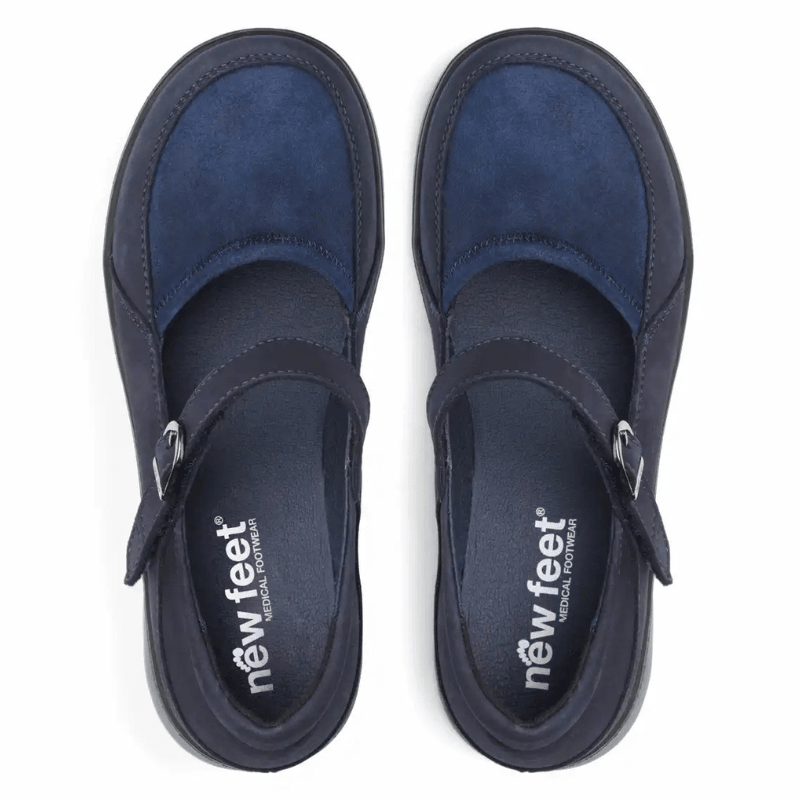 Ballerina New Feet blu scuro in pelle morbida e naturale con dettagli in camoscio, progettata per offrire comfort per tutto il giorno. La scarpa ha un intelligente sistema di chiusura con un unico cinturino in velcro sulla parte superiore del piede, facilmente regolabile per garantire una vestibilità ottimale.