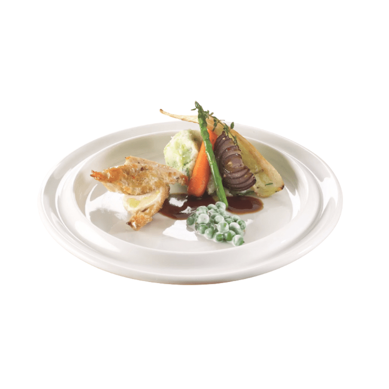 Elegante piatto in porcellana Steelite con bordo interno che facilita il sollevamento del cibo su cucchiaio/forchetta. Questo design lo rende ideale per le persone che possono usare solo una mano per mangiare. Inoltre, il bordo sagomato rende facile tenere e trasportare il piatto.