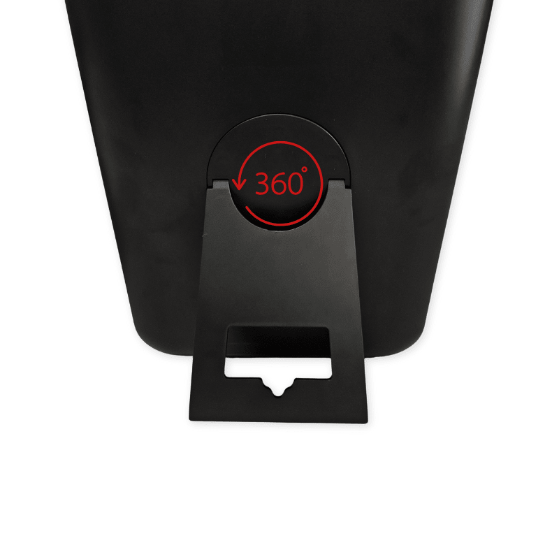 Støtten på bagsiden af spejlet kan rotere 360°, så spejlet kan anvendes fra flere vinkler. Når støtten er slået ind, kan spejlet desuden hænges på væggen.