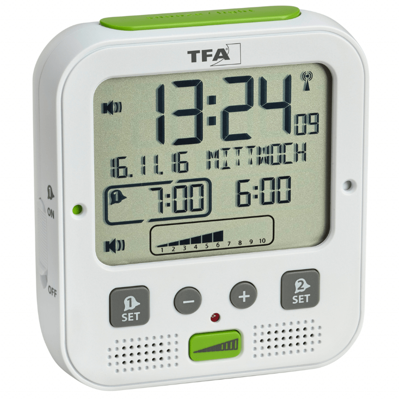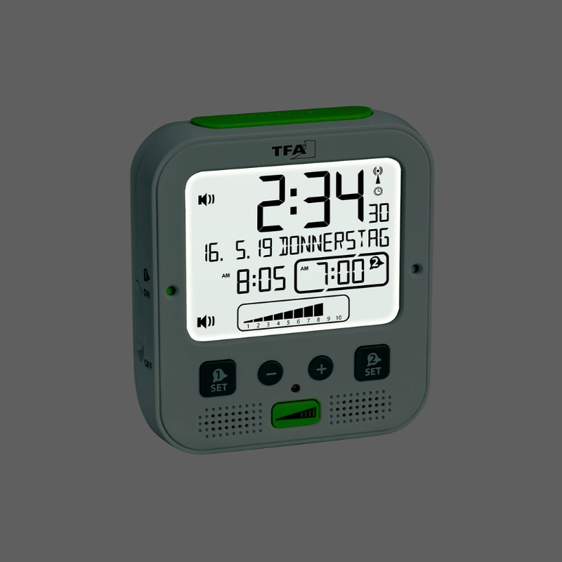 Dette trådløse vækkeur er udviklet til dig, der har brug for en ekstra effektivt alarm. Uret kombinerer høj lyd, kraftige vibrationer og blinkende lys – så du med sikkerhed vågner til tiden, uanset om du sover tungt eller har nedsat hørelse. Alle disse funktioner kan kombineres med hinanden og justeres individuelt.