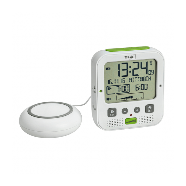 Vækkeuret leveres med en vibrationspude, som kan placeres under hovedpuden eller madrassen. Når alarmen går i gang, vibrerer puden samtidig med, at den høje alarmlyd og de blinkende lys vækker dig på en skånsom, men effektiv måde.