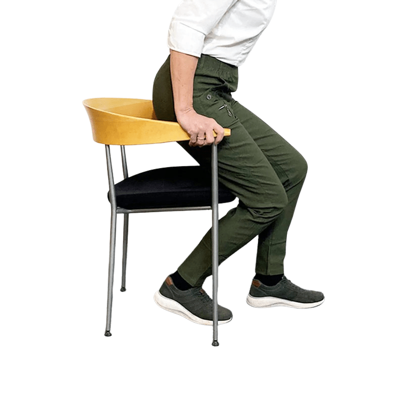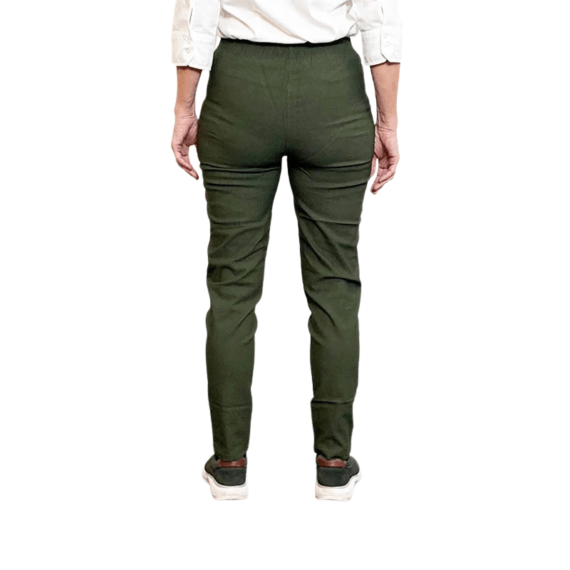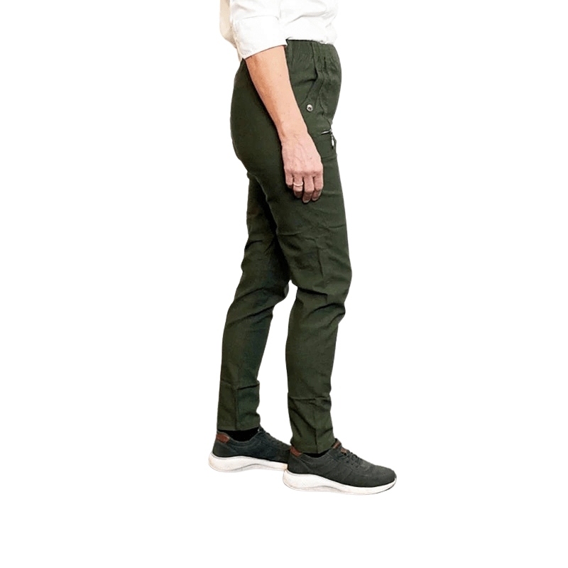 Smarte og behagelige bukser i en dyb olivengrøn farve med fastsyet elastikkant, der passer godt til de flester kropstyper.