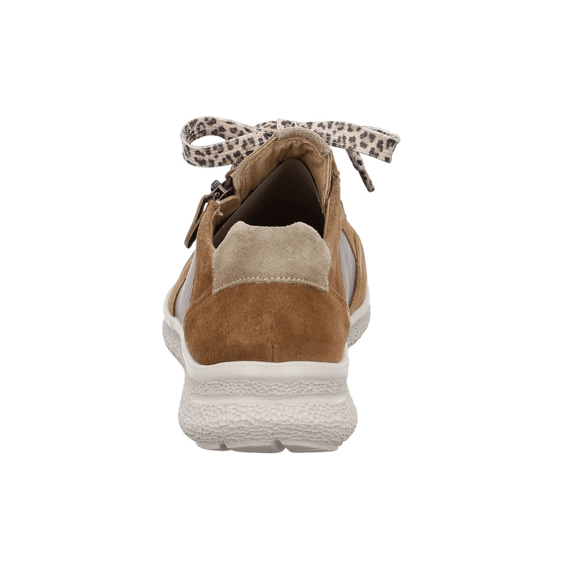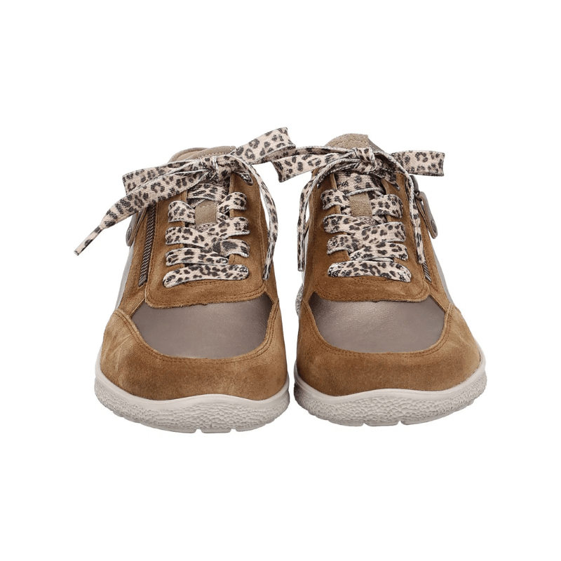 Smart og tidløs brun damesneaker med let glans fra Hartjes. Skoen har snørebånd i smart leopardprint samt en lynlås i siden, så den er nem at tage af og på.