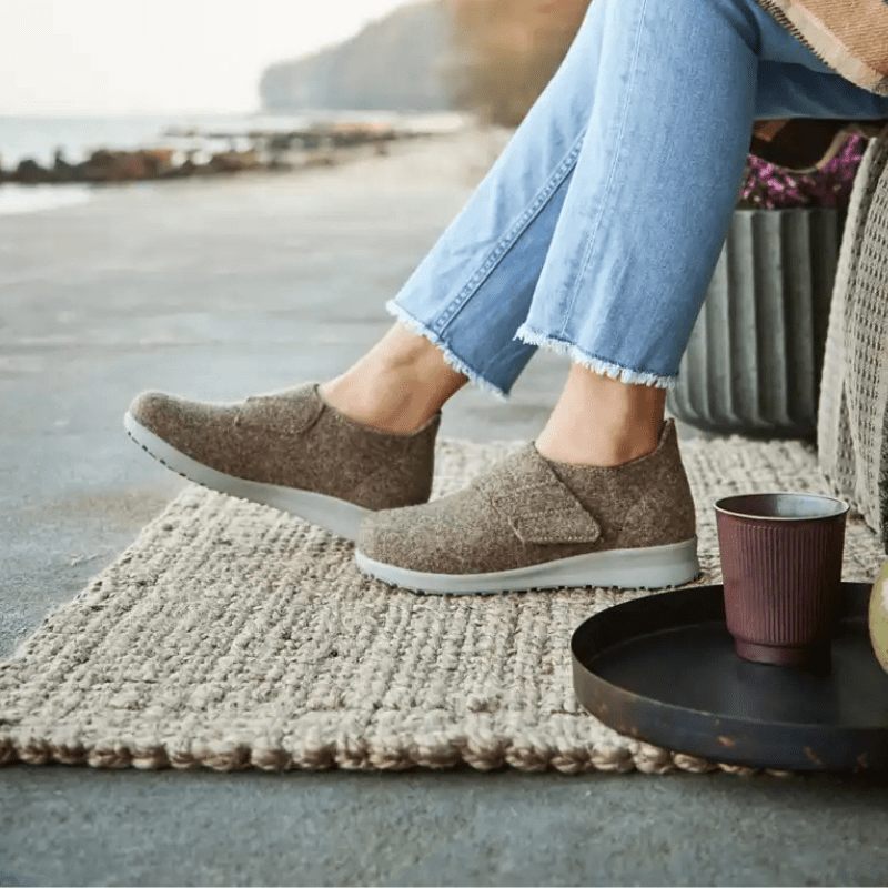 Varm hjemmesko fra New Feet i 100% sandfarvet uld med en bred velcrorem over vristen. der gør skoen nem at tilpasse til foden.