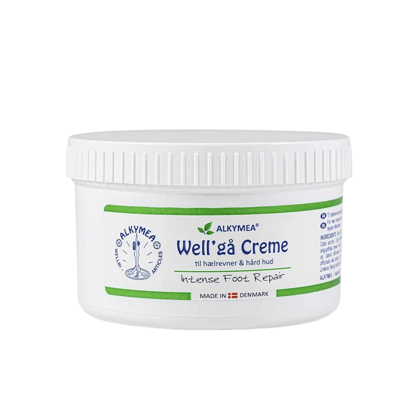 Well'gå er en fast salve med kamille og olivenolie til brug ved hælrevner, hård og tør hud på fødder, albuer og neglebånd.