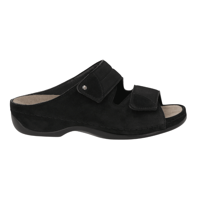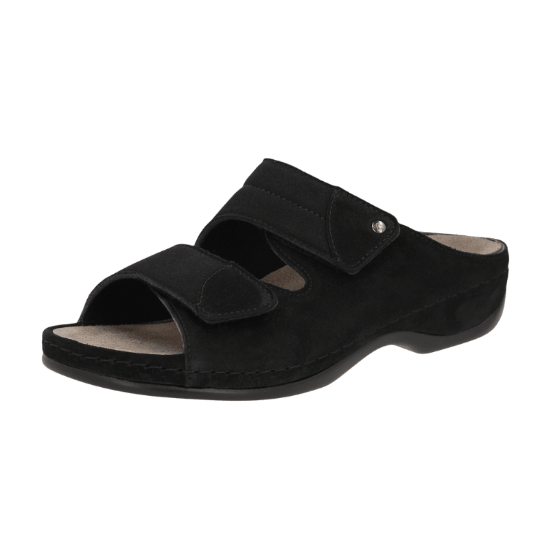 Comoda pantofola da casa Berkemann in morbida pelle scamosciata nera con inserti stretch che si adattano delicatamente al piede, garantendo una calzata soffice e flessibile. Il design elastico allevia la pressione, rendendo questo modello ideale per chi soffre di alluce valgo e per chi ha piedi sensibili.