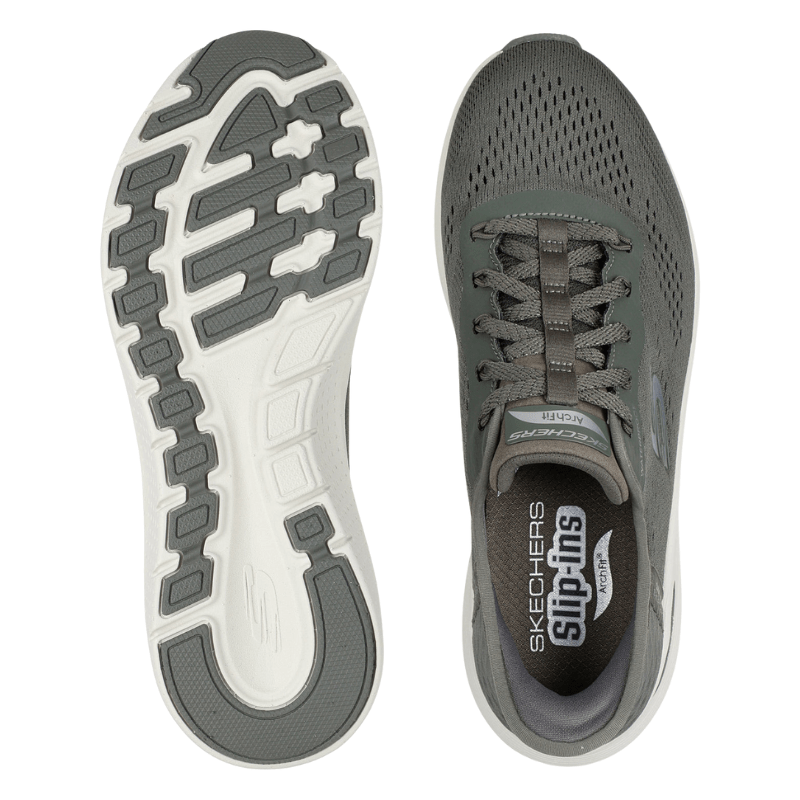 Sneaker slip-in da donna flessibile e leggera di Skechers in tessuto color oliva, dotata di membrana impermeabile e tecnologia Arch Fit, che offre un supporto plantare mirato.